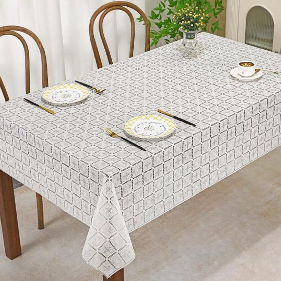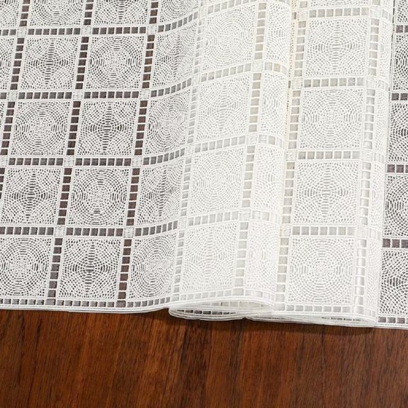 Скатерть декоративная в рулоне шириной 137 см длиной 20 метров. Толщина варьируется от 0,4 до 0,6 мм, плотность материала около 390 г ± 15 гр, в зависимости от рисунка. Полупрозрачная структура и ажурная отделка придает легкость в оформлении интерьера.