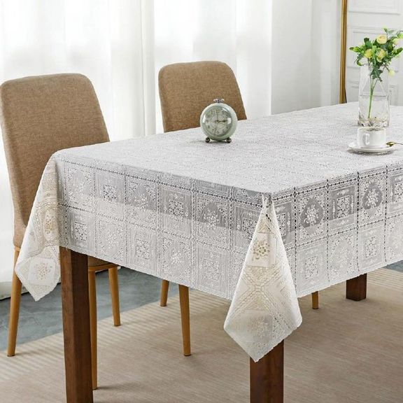 Скатерть декоративная в рулоне шириной 137 см длиной 20 метров. Толщина варьируется от 0,4 до 0,6 мм, плотность материала около 390 г ± 15 гр, в зависимости от рисунка. Полупрозрачная структура и ажурная отделка придает легкость в оформлении интерьера.