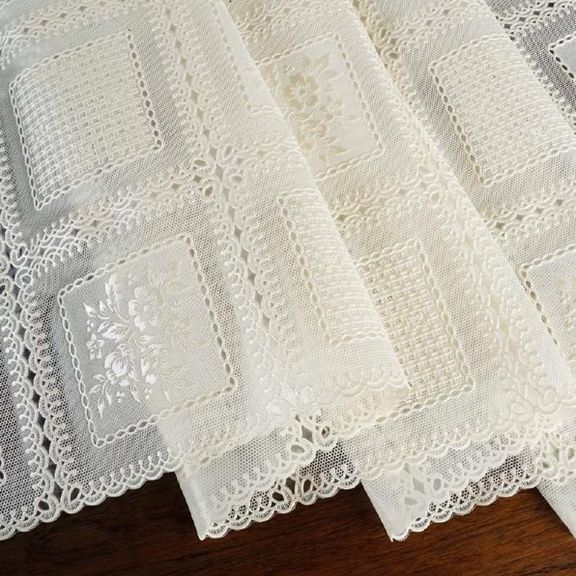 Скатерть декоративная в рулоне шириной 137 см длиной 20 метров. Толщина варьируется от 0,4 до 0,6 мм, плотность материала около 390 г ± 15 гр, в зависимости от рисунка. Полупрозрачная структура и ажурная отделка придает легкость в оформлении интерьера.