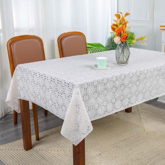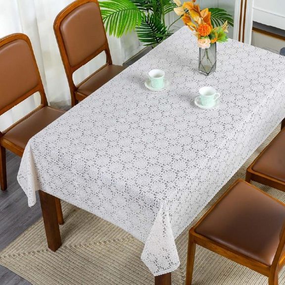 Скатерть декоративная в рулоне шириной 137 см длиной 20 метров. Толщина варьируется от 0,4 до 0,6 мм, плотность материала около 390 г ± 15 гр, в зависимости от рисунка. Полупрозрачная структура и ажурная отделка придает легкость в оформлении интерьера.