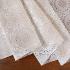 Скатерть декоративная в рулоне шириной 137 см длиной 20 метров. Толщина варьируется от 0,4 до 0,6 мм, плотность материала около 390 г ± 15 гр, в зависимости от рисунка. Полупрозрачная структура и ажурная отделка придает легкость в оформлении интерьера.