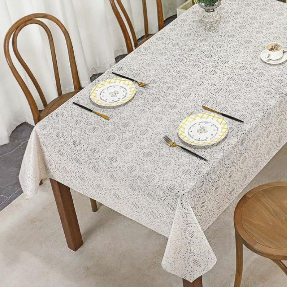 Скатерть декоративная в рулоне шириной 137 см длиной 20 метров. Толщина варьируется от 0,4 до 0,6 мм, плотность материала около 390 г ± 15 гр, в зависимости от рисунка. Полупрозрачная структура и ажурная отделка придает легкость в оформлении интерьера.