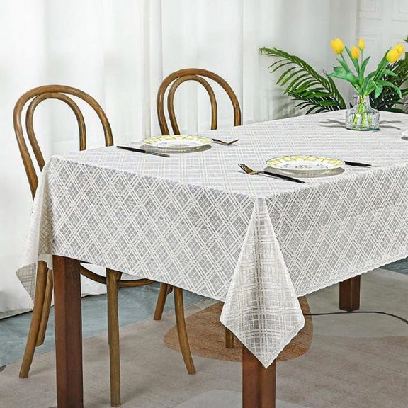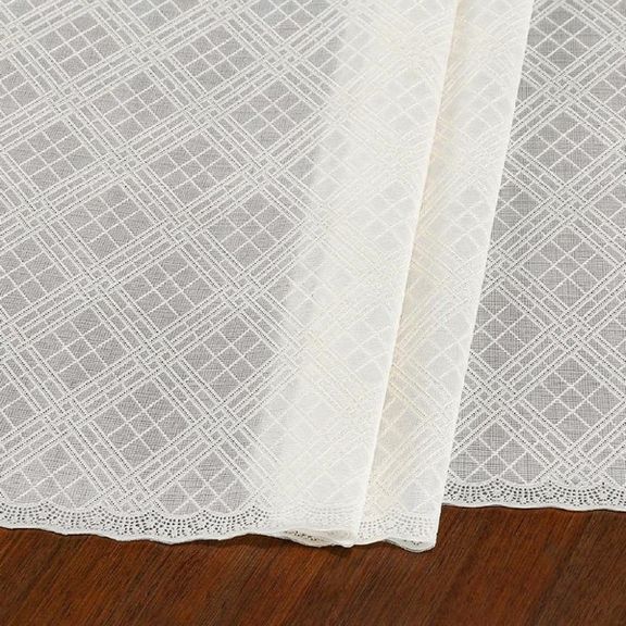 Скатерть декоративная в рулоне шириной 137 см длиной 20 метров. Толщина варьируется от 0,4 до 0,6 мм, плотность материала около 390 г ± 15 гр, в зависимости от рисунка. Полупрозрачная структура и ажурная отделка придает легкость в оформлении интерьера.
