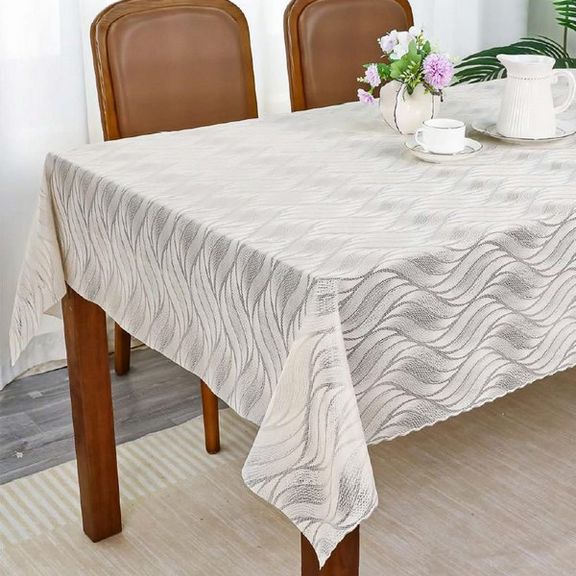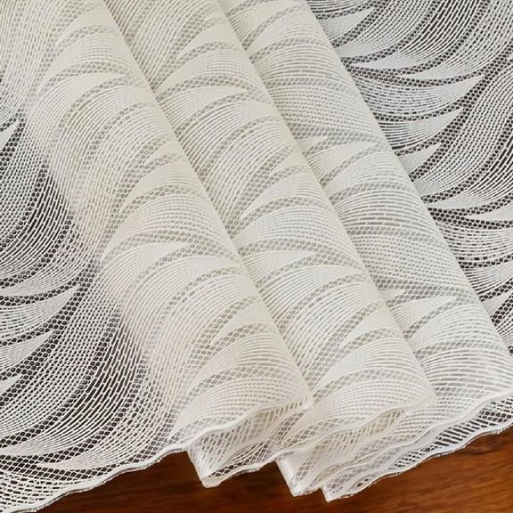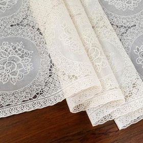 Скатерть декоративная в рулоне шириной 137 см длиной 20 метров. Толщина варьируется от 0,4 до 0,6 мм, плотность материала около 390 г ± 15 гр, в зависимости от рисунка. Полупрозрачная структура и ажурная отделка придает легкость в оформлении интерьера.
